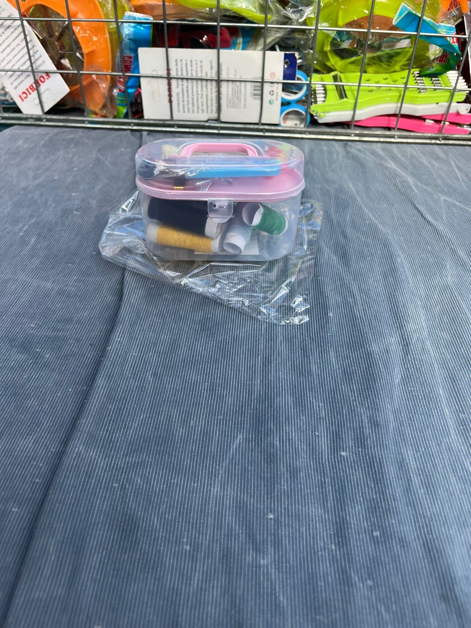 Set cucito con valigetta, contenente:forbicine per cucito; vari colori di cotone; metro; bottoni; spille; proteggi dito.